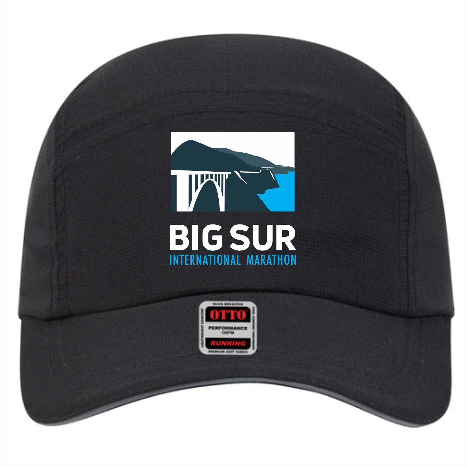 Big Sur International Marathon Embroidered Headwear. Technical 5-panel unstructured running cap featuring Pongee panels, reflective back strip on velcro strap, soft front panel, black underbrim, moisture-wicking and antimicrobial sweatband. OSFM. Item ID biphgC211